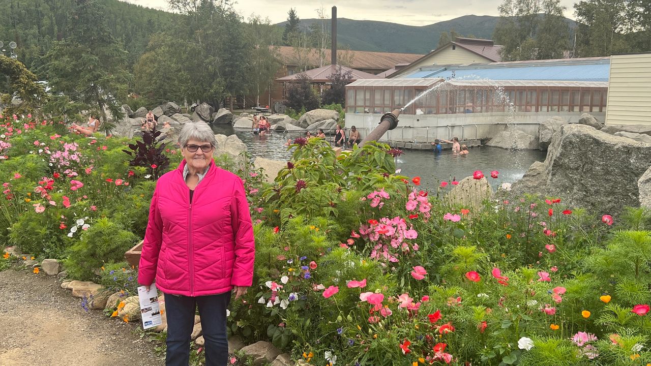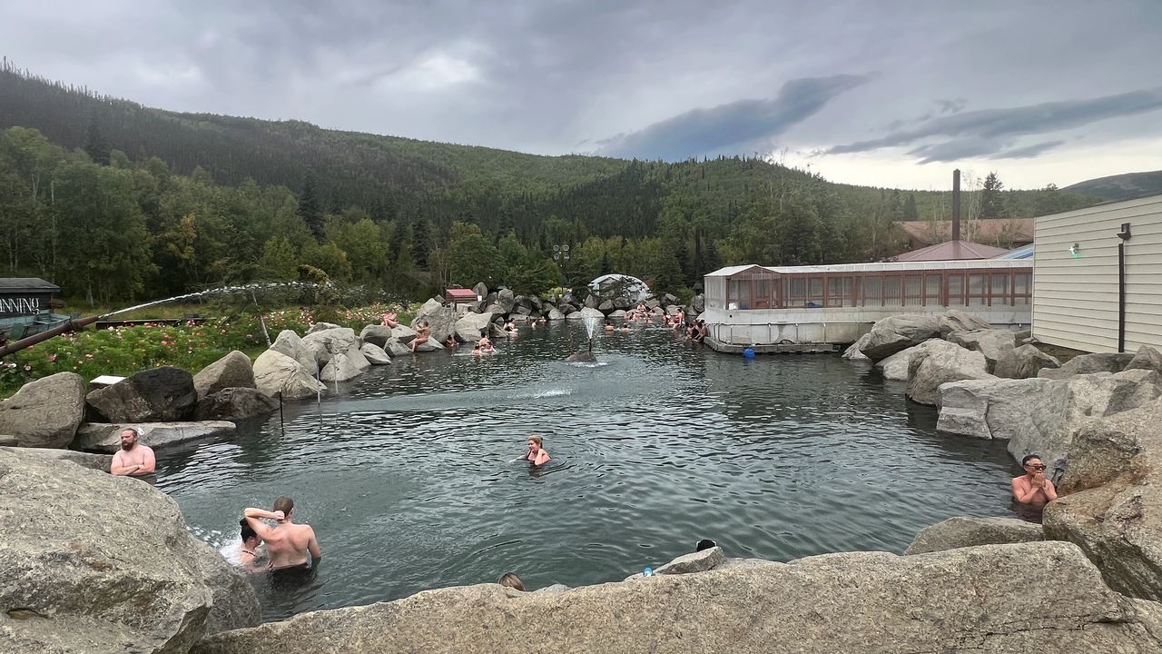 We picked up mom at the Airport at 1:45 am and went straight to bed. We slept in till almost noon then packed it up and headed to Chena hot springs but not before stopping at Fred Meyers and REI for some quick items... never quick... We got to Chena Hot springs just a short 64 mile ride north east of Fairbanks. We got a great pull through spot, ate some dinner, chilled a bit, then we slipped into our swim suits and headed to the hot springs. Chena Hot Springs resort has hotel rooms and a small 24 site RV parking area with no hook ups. The Ice Museum that has Ice Sculptures and a bar was closed due to maintenance so we were not able to check that out. Later we find out the bar was open where you could get an Appletini in a ice glass. Bummer missed that, will do that next time. The springs were hot and did not disappoint. Yoli and I get a walk in before bed time and call it a day.