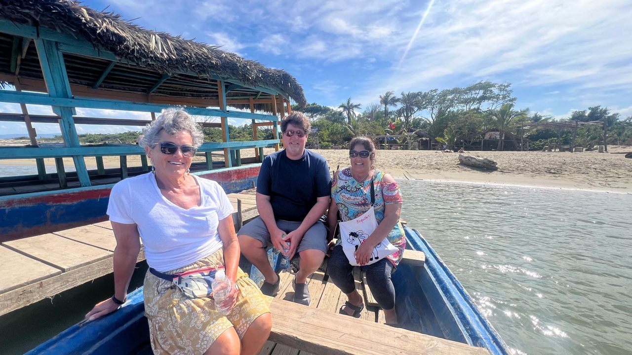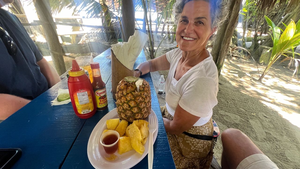 Today for Valentines day, we headed to Wilson La Boca Restaurant for lunch. This was going to be an excursion, as we have to drive a mile on sandy bumpy road along the ocean, then take a small boat across the mouth of the river "La Boca" to Wilsons's restaurant and bar. It was a fun day. We had pina colada in a pineapple, Santo Libre's, and whole baked Parrot fish, head on. Shrimp, dirty rice, and plantains were also part of the mix as we wiggled our toes in the sand under the table under the palapa (Palm hut). Back to the Villa for some pool side R&R before we went back to our favorite spot at Ojo's for some pizza and lasagna on the beach.