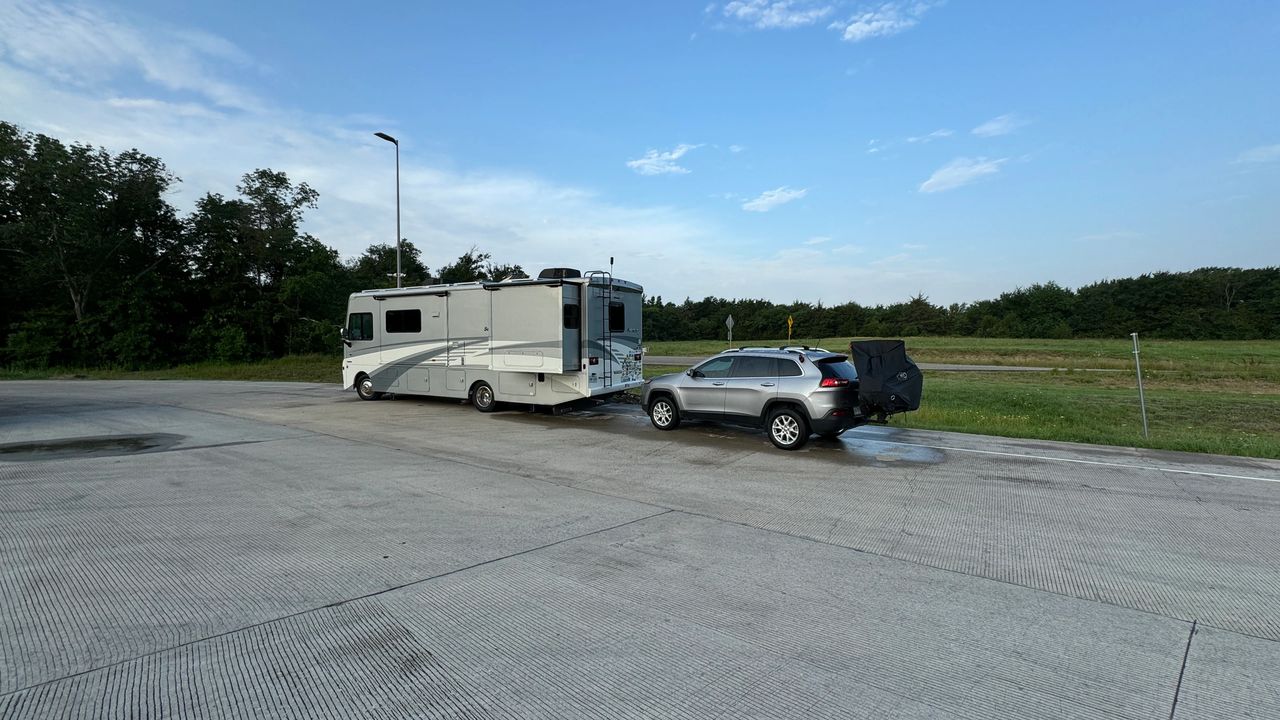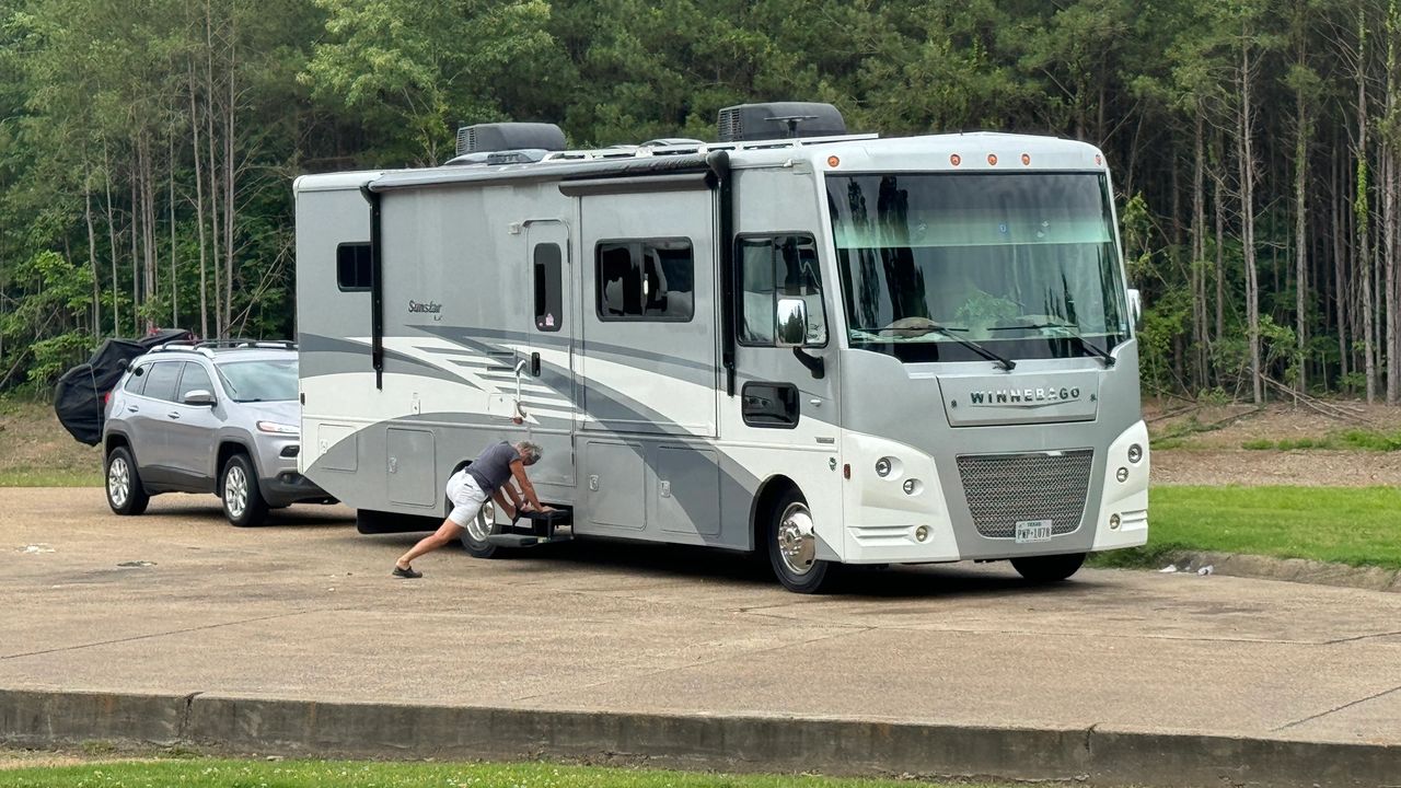 We did not sleep well, only 5-6 hours of sleep. We still got up around 7am, had our coffee, went for a short walk, then back on the road. No rain today and overcast in the 70’s so pleasant driving but lots of truck traffic, surprising for Sunday and Mothers day. We stopped three times for a food break or fuel. On our fuel up at the truck stop, I weighed the rig and we came in a bit over weight by about 1300 pounds on the back axle and 1000 pounds over the GCVW overall weight. Not great but expected. We have oversized tires (higher load) and I have added air bags on the back end to help support the weight. Maybe that is why it drives well for a gas rig, we are heavy. Tonight we pulled into a rest stop in Jackson, TN early around 7-7:30, took a hot shower and called it a day.