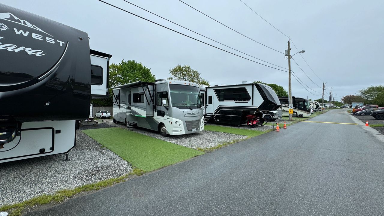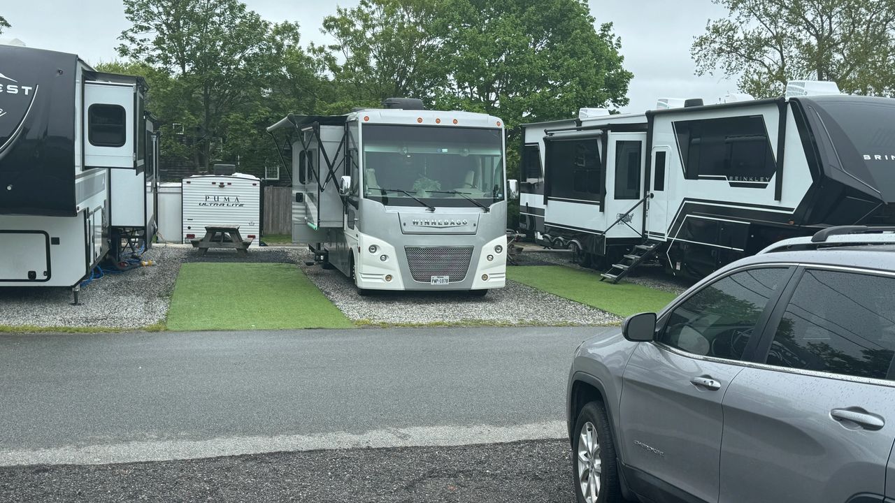 Travel days to New England. We have 508 miles to get there so we we broke it down into two days. Day 6 after Reston Sister visit, we made it to New Jersey for a noisy rest stop next to the freeway. Not a great night sleep for sure. We got up early and were on the road by 8am. It was Saturday and traffic was much less than expected as we crossed the Mario Cumo Bridge through New York and into Connecticut. We stopped at an overview in Mystic CT for lunch then easily made it into Newport RI to our next extended stay at the Meadowlark RV Park with full hookups for 4 nights.