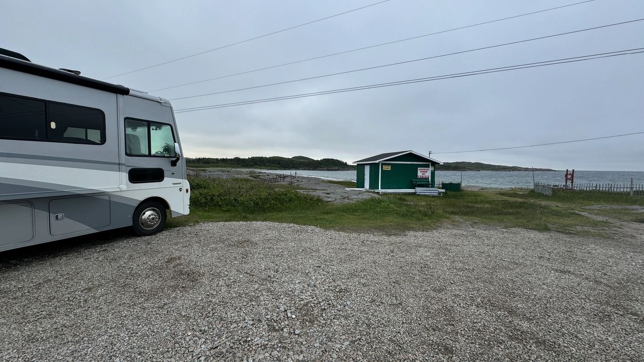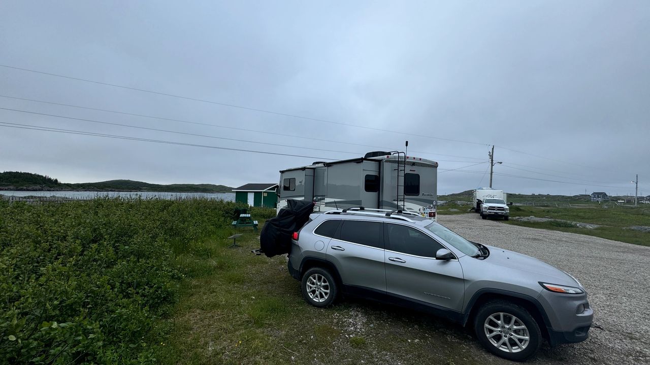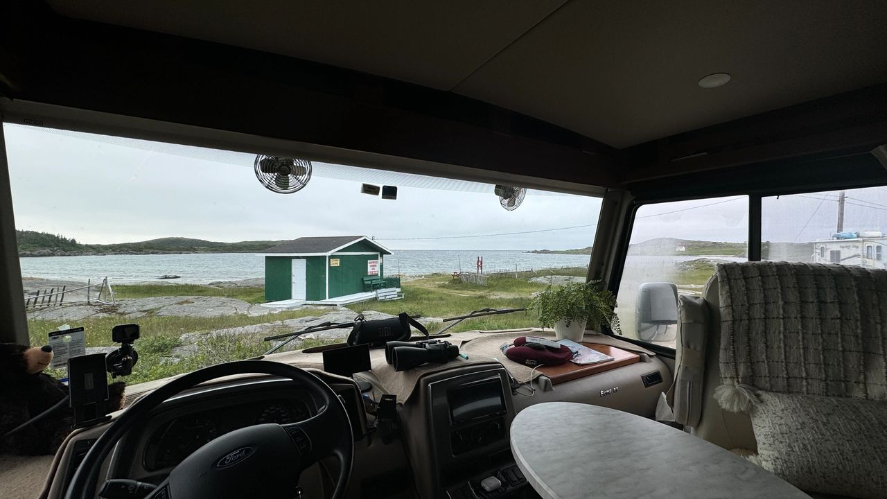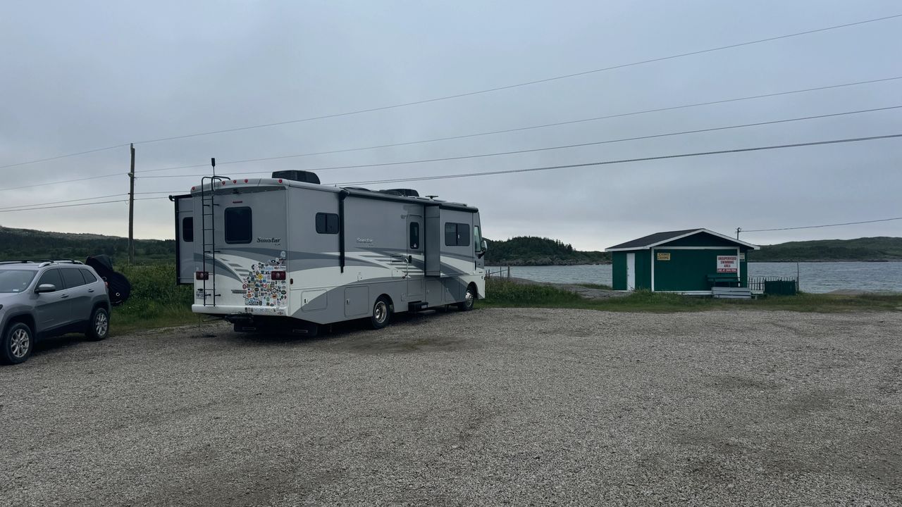 Today was a travel day, and a rain day unfortunately. We only drive 46 miles to the Fogo Island Ferry terminal, expecting the to wait a few hours for a ferry, but with luck, the 10:30 ferry was over an hour late. We only wait about 30 minutes to board the ferry to Fogo Island. Once on the island Two ferries away from the mainland, we trek across the island in search of a good boondock spot. We stopped at the visitor center for some inside info, then we head down the road. We avoid Fogo camp ground as we don't like RV parks, we find a spot in Joe Batt's Arm, but it already had a couple RV's and was small and crowded municipal park. We unhook the Jeep and drive farther down the road to Tilting Cove another target boondock spot. Score! we find an empty beach spot and we nose up to the beach in the cove with our buddies that are with us. One other camper came in, but we had the best spots on the cove. Now if the sun would just come out tomorrow it will be perfect. No hikes, no adventures today, just a travel day in Newfoundland and another Ferry ride. A local did drop by, Roy Dwyer, a NL writer and story teller, (said so on his magnetic door sign on his pickup). Roy showed us his books, he even read us a poem from one, a real local Newfie. So we bought a couple :)