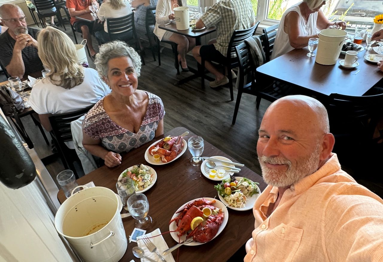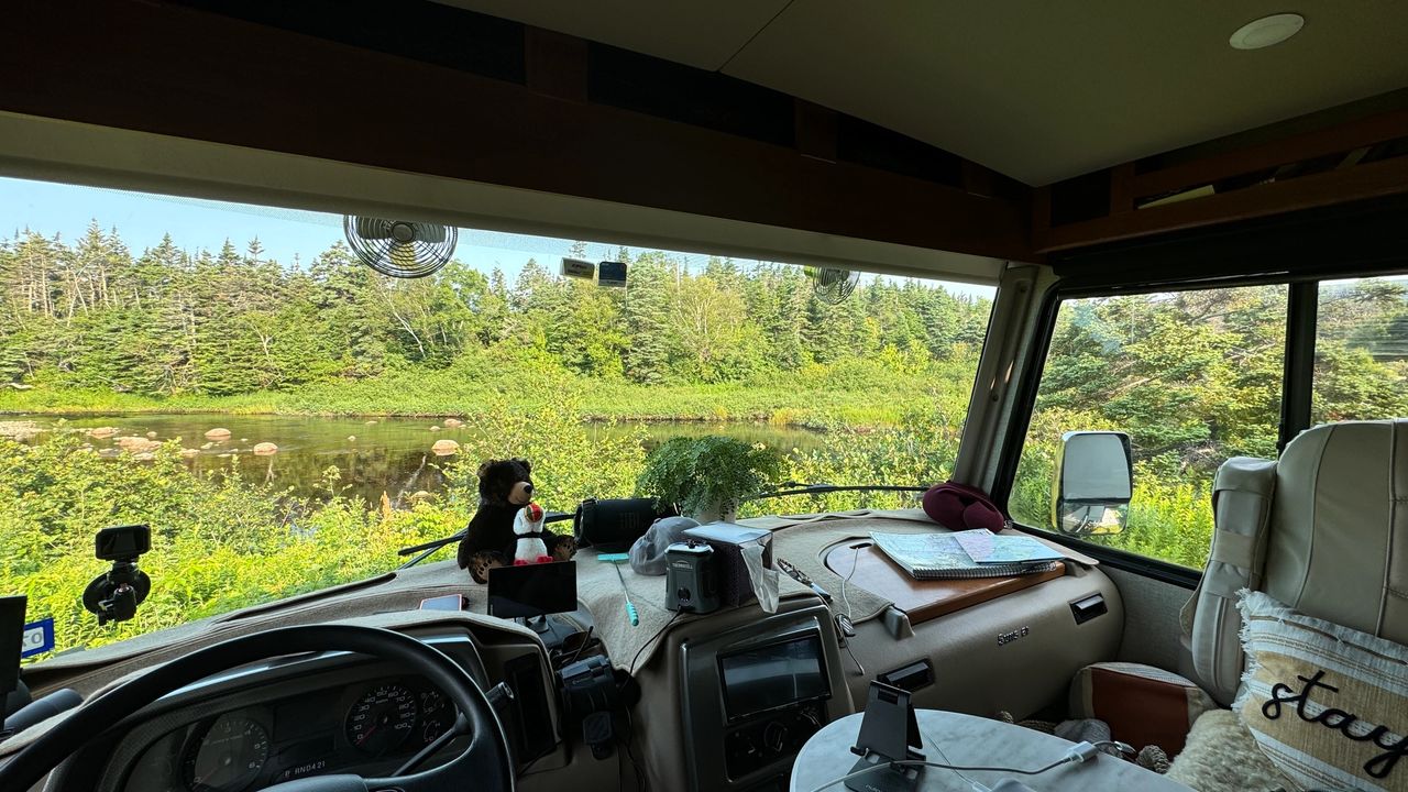 We say goodbye to Newfoundland after 65 days on "The Rock" as they call it locally. We we actually had reservations for the ferry on Aug. 3, but we were ready to get on with our home bound trip. We rebooked for July 29, only to find out when we arrive a the terminal at 9pm, our tickets say Aug. 29, not July 29. I was in panic mode as Yoli is in the Jeep at one gate, and I am in the RV in another gate, we are chatting on the radio's swapping booking numbers, holding up traffic trying figure out if we can even get on this ferry that is totally booked. Yoli's gate agent was a champ, they wrote it off as agent error and booked us on the ferry for the 11:45pm overnight trip we thought we were booked on. We did not have a cabin so we had to sleep in the chairs, which was aweful. But hey, I was glad to get on the boat and not sit and wait for weeks to get on. We got off the ferry at 7am with very little sleep. We drove a half mile to a local park on the wharf and popped the slides and took a 3 hour nap. Later in the day we go for a walk and only get 50 yards before we engage with some local ladies that live locally and have been friends for 68 years. We chatted about local lore and our trip and certainly enjoyed the sunshine wharf side chat. That is the thing I did not expect, and the thing I will remember the most, the people of Newfoundland and this area have just been so welcoming and helpful. It was a blast meeting so many wonderful people. We talked so long we decided to postpone our next segment of our trip up Cape Breton on the Cabot trail. We head to Baddeck Nova Scotia where we here they have the best seafood dinner. And it was, it was awesome. We got the all you can eat seafood chowder and mussels with a whole lobster chaser with desert and coffee. It was awesome, we only drove 45 miles today, but certainly had good food and good chats with new friends. We pulled into a gravel area just a block from the restaurant we found on iOverlander and popped the slides to call it a day.