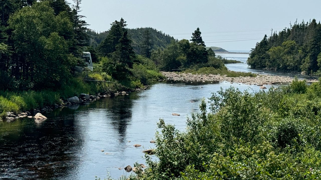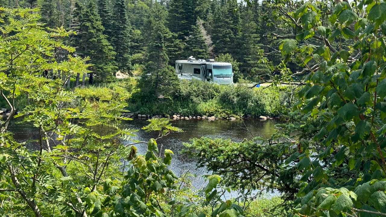 We woke up this morning to sunshine and blue skies. So much better than the all day rain yesterday driving to get to Cape St. George. We hiked the local coastal Danny's trail at The Gravels between Port au Port East/West. We just love these coastal hikes, and when the sun shines, it is fantastic. Since it is Saturday, many locals were coming out for the hike so we packed it up and headed to JT Cheeseman provincial park further south only 6 miles from the ferry terminal. So this weekend we got a sweet spot on the river before we load the rig on the Ferry back to the mainland and say goodby and farewell to Newfoundland. We have been here just over two months and it is time to head home, or at least in that general direction south.