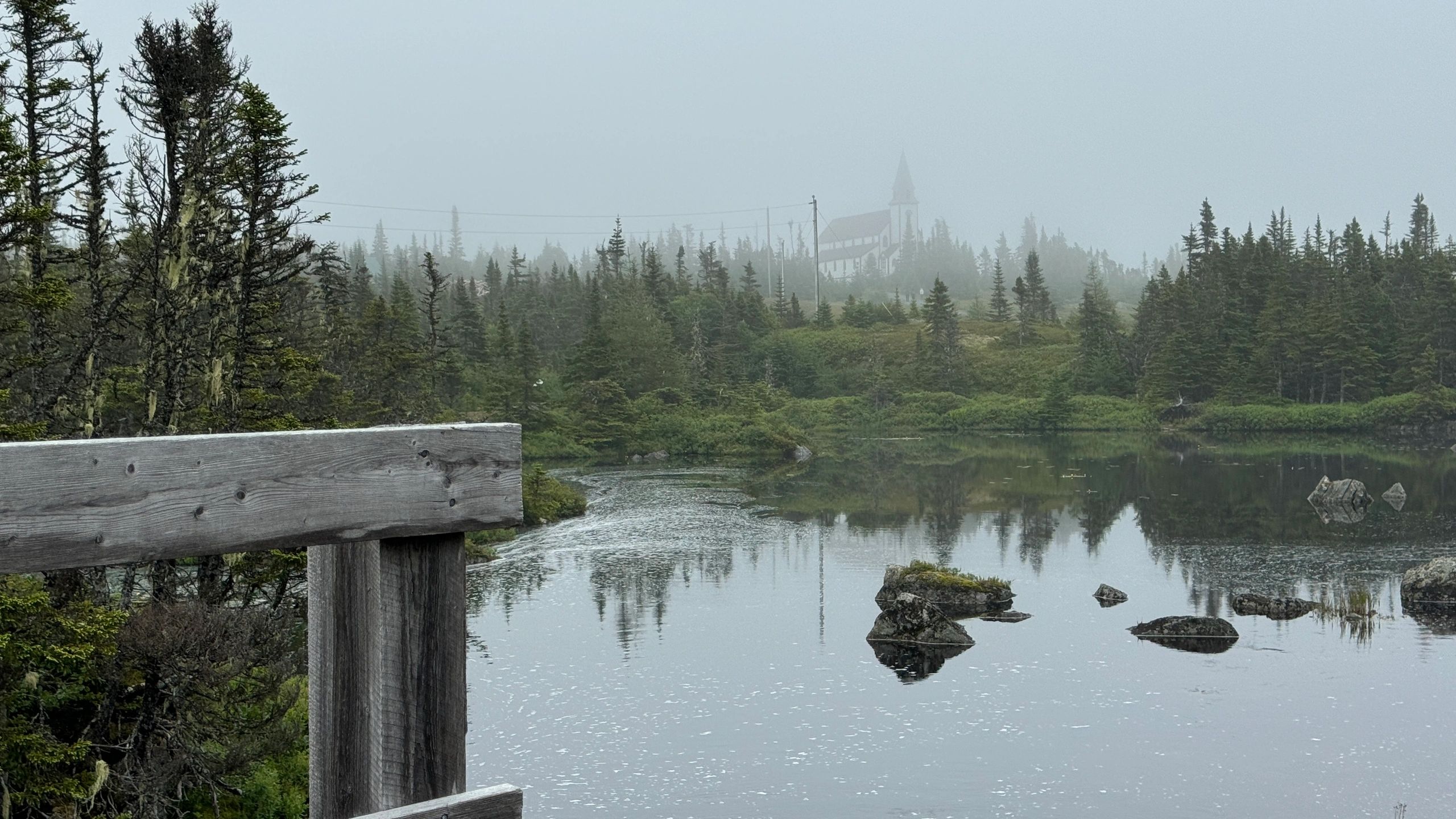 The fog came in last night and was still lingering this morning. We sleep in, have coffee, then around noon we decide to take a drive to Trinity lighthouse and new Bonaventure. We stop by an off the road place on the way and I mean off the road. We drive down some dirt paths that we spread the bushes with the jeep and squeeze through at sections. The target was an old abandon railroad and carnival. We get there and find some old train cars and out buildings, the remains of a ferris wheel, and a miniature golf area. Its by a lake and is quite abandon. We take some pictures, then move on to the lighthouse with some great cliff views and of Trinity in the bay. Next stop was New Bonaventure where a movie set was made for a movie call Random Passage. We stop by the old church and tea room where some local entertainment was going on, it was Sunday, so many people were there. On the way back to the camper, we stop in Trinity at the harbor restaurant for some awesome seafood chowder and the best apple dumpling I have ever had. We sip some coffee, then head home and call it a day.