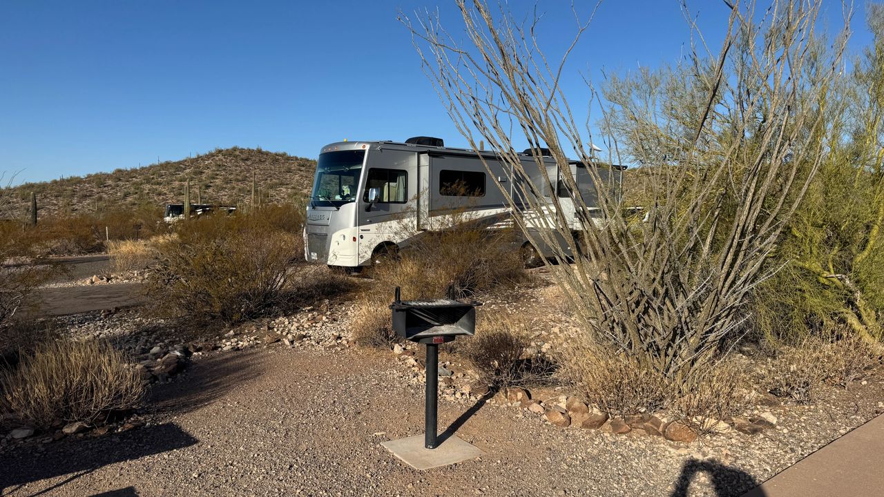 We move further south today towards the Mexico border to a place called Organ Pipe Cactus National Monument. This is one of my favorite National Campgrounds with very good basic facilities and well kept for $10/night dry camping but access to bathrooms, showers, water, and dump station. After sleeping in too late, we missed our morning walk and just rolled up camp for a 3 hour drive today. We first stopped in Buckeye AZ on the way at Walmart to drop off a FedEx return package and load up on some more groceries. With our late start we just barely made it to Twin Peaks Campground before dark, but well past sunset. We did get a beautiful sunset on the drive south of Phoenix. We rolled in setup camp, dinner and a movie, then off to get some Z's. Temps in the 60's tomorrow and sunshine, can't wait for some cool hikes in the area.